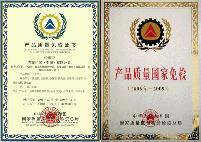 TOTO潔具獲得產品免檢證書