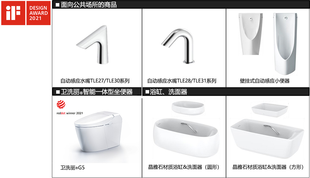 2021年iF設計獎日前揭曉,TOTO旗下包括衛洗麗®G5、自動感應水嘴、壁掛式自動感應小便器、晶雅石材質浴缸&洗面器在內的多款產品榮膺該項殊榮。其中衛洗麗®G5更是榮獲了2021年紅點獎和iF設計獎兩項大獎于一身。