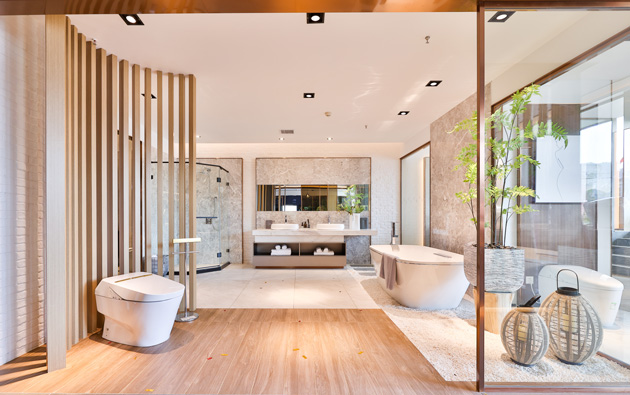 步入店內(nèi),TOTO杭州新時(shí)代旗艦店的門店設(shè)計(jì)與陳列形式,秉承TOTO自然環(huán)保的衛(wèi)浴理念,模擬江南特有的典雅的氣質(zhì),打造出一步一景的高端展示空間。