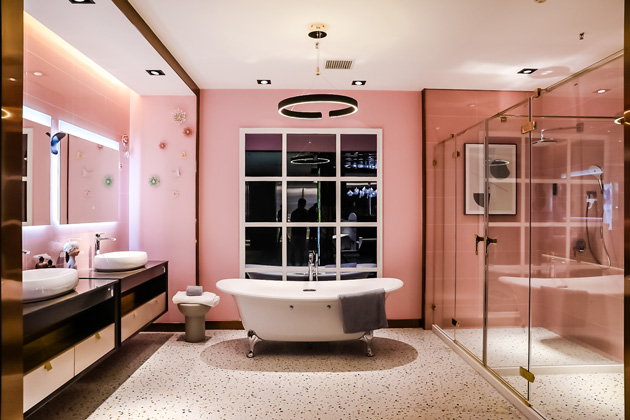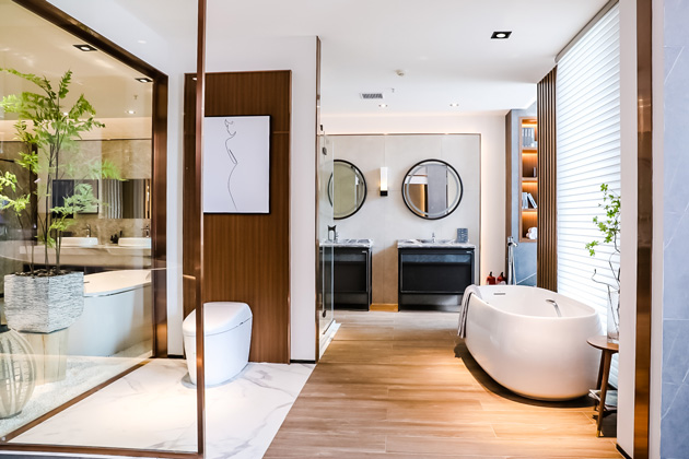 1F展示酒店、民宿等高端精品樣板間, NX產(chǎn)品及高端G系列龍頭的的獨(dú)立造景的展示模式,體現(xiàn)TOTO產(chǎn)品的輕奢風(fēng)格,營(yíng)造出置身奢侈品店的體驗(yàn)效果。
