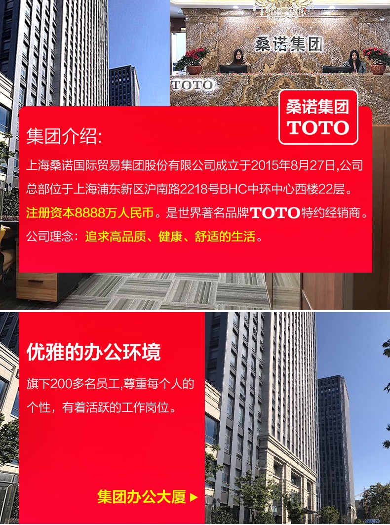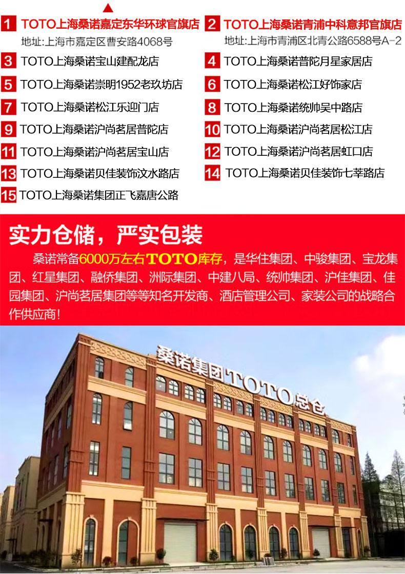 桑諾集團常備6000萬TOTO庫存,是陽光城集團、佳兆業集團、中駿集團、寶龍集團、紅星集團、融僑集團、華住集團、洲際集團、中建八局、建工集團、統帥集團、滬佳集團、佳園集團、滬尚茗居集團等等知名開發商、酒店管理公司、家裝公司的戰略合作供應商。