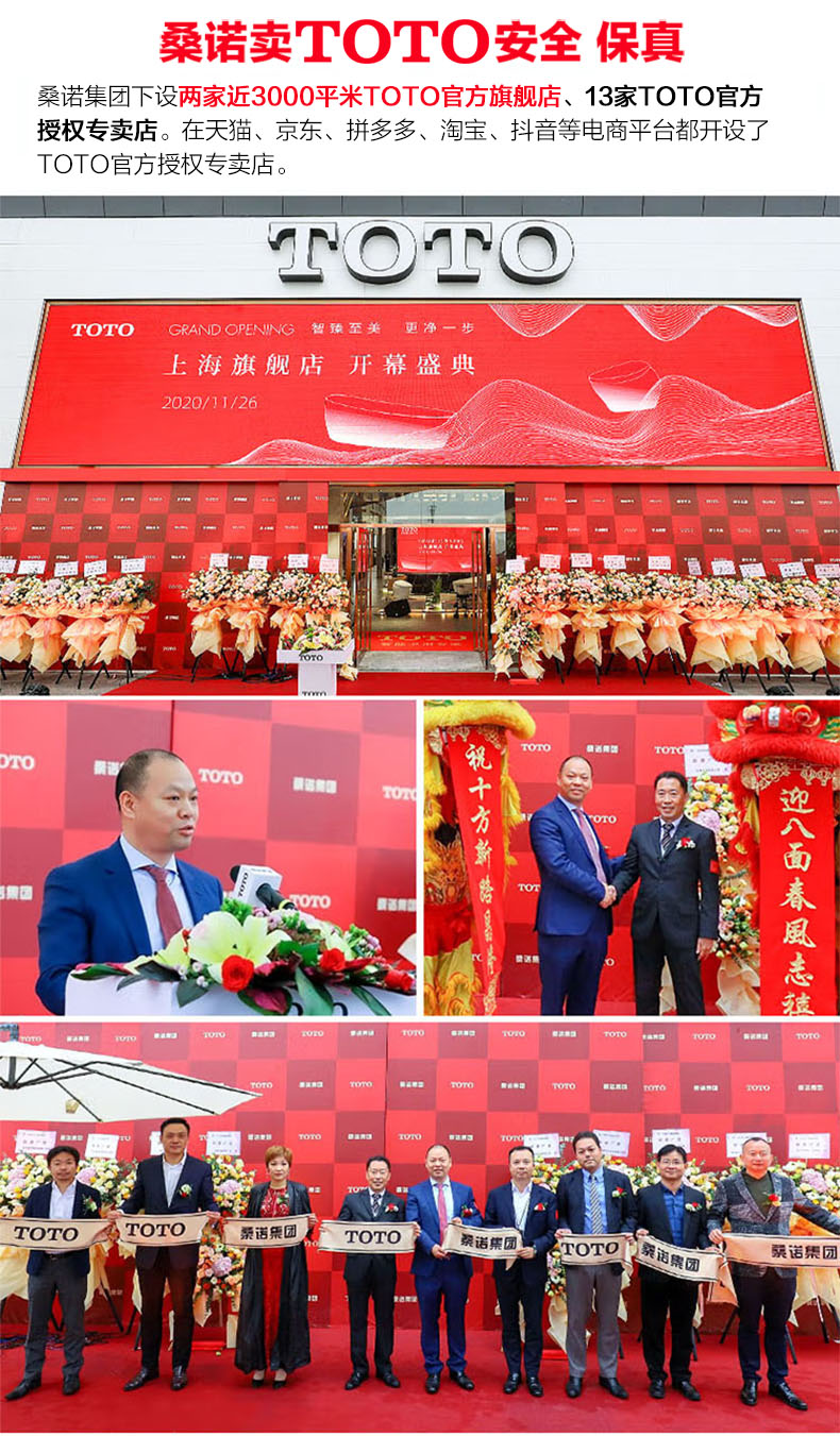 是世界著名品牌TOTO授權經銷商。桑諾集團旗下設兩家近3000平米TOTO官方旗艦店、13家TOTO官方授權專賣店。在天貓、京東、拼多多、淘寶、抖音等電商平臺都開設了TOTO官方授權專賣店。